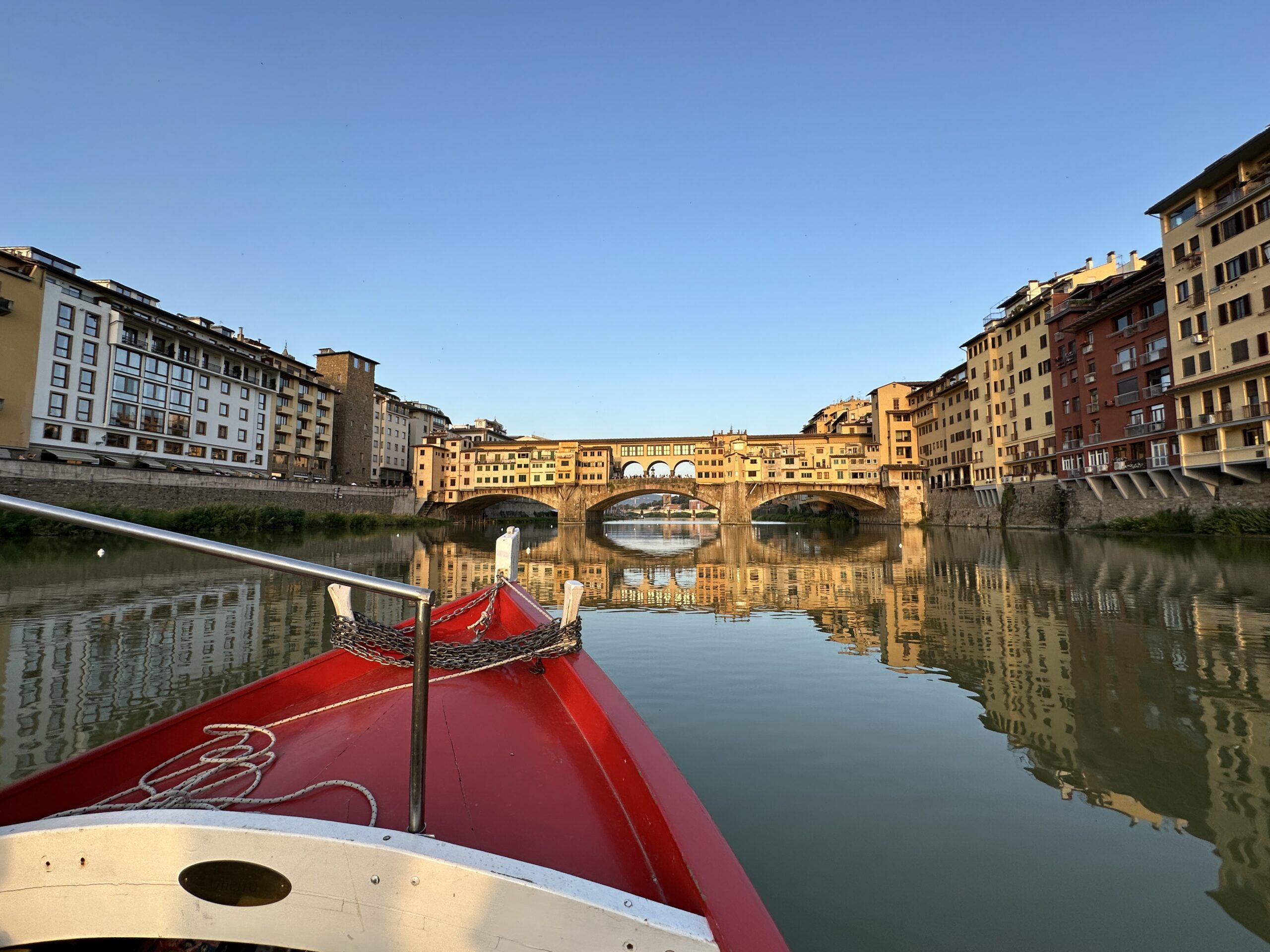palazzi reflected on the water, the gentle sound of oars, and the golden light painting Florence’s